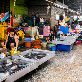 There are food markets all over Bangkok. The below pictures are from the Klong Toey market, an enormous traditional market spanning several city blocks. There were very few non-Thais shopping there when I walked through. The produce is gorgeous and incredibly fresh. The meat and fish were hard for me to look at. Many of the fish stalls had live fish flopping in the pans and bins, splashing people as they walked by, with guys cutting their heads off and preparing them for sale. The poultry section was full of live birds in cages, which the sales people would pull out on request, by the neck and throw on a scale for buyers. Cruel as all of that is to see, people who shop in these kind of markets are much closer to their food than most people in the west, who buy it neatly packaged, renamed and so removed from the kill that most never think about it.